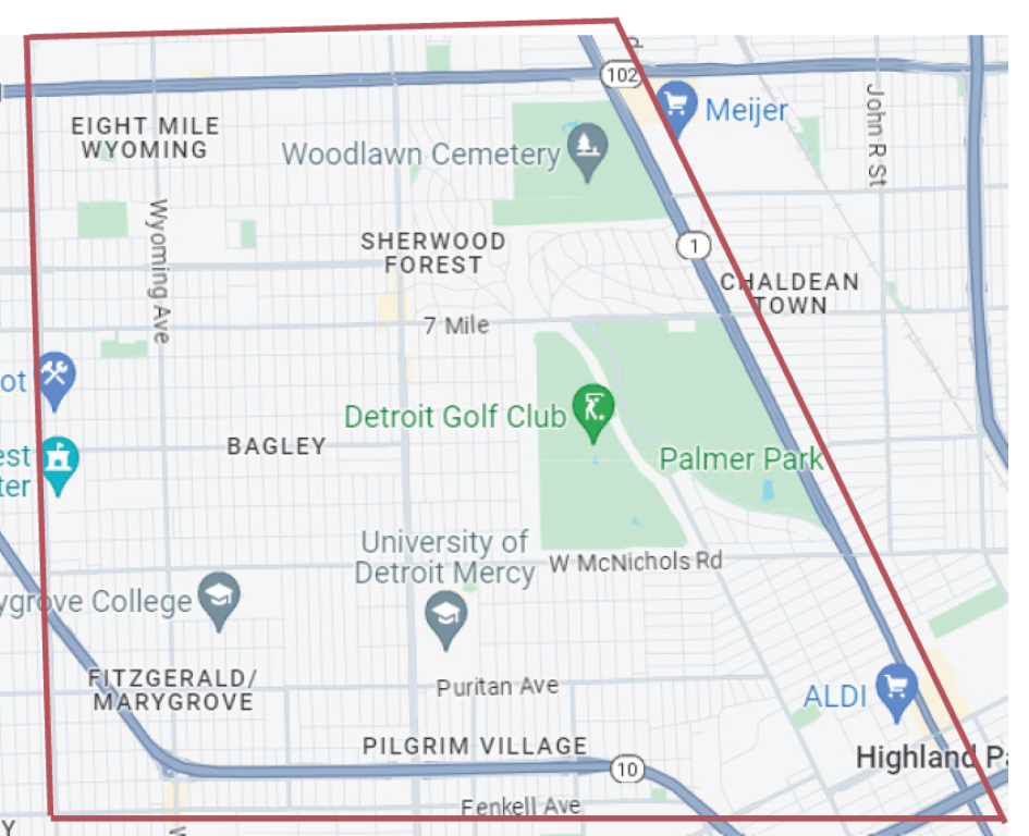 Boundaries: North: Eight Mile Road East: Woodward Avenue South: Fenkell Road West: Meyers Road This area makes up the “Gesu Neighborhoods.”